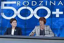 Une loi, votée début 2016, revalorise les allocations familiales en les portant à 500 złotys (soit 115 euros) mensuels par enfant à partir du deuxième enfant. Surnommée « Famille 500+ », cette mesure est financée par une taxation spéciale des entreprises[24]. Le pays enregistre ensuite une hausse des naissances avec 33 000 nouveau-nés de plus entre fin 2015 et fin 2017, liée selon l'Office central des statistiques à l'augmentation des aides sociales, qui précise que les nouvelles naissances concernent principalement le deuxième, troisième ou quatrième enfant[25].