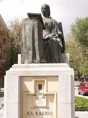 Beatriz Galindo, dite la Latina, est une personnalité madrilène et une éducatrice espagnole de la fin du XVe siècle et du début du XVIe siècle, longtemps membre de la cour d'Isabelle la Catholique et conseillère de la Reine. Elle a également fondé et géré plusieurs institutions sociales et religieuses à Madrid. Son parcours est relativement nouveau : jusqu'à la Renaissance, les femmes érudites dans les pays latins étaient surtout des religieuses. C'est l'humanisme qui va mettre davantage en exergue le modèle de la femme laïque éduquée et notoire, personnalité culturelle voire politique de son temps sans être membre d'une lignée dynastique, dont Beatriz Galindo est un bon exemple (même si Christine de Pizan peut incarner aussi ce modèle, un siècle auparavant).