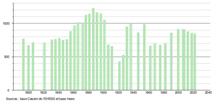 L'évolution du nombre d'habitants est connue à travers les recensements de la population effectués dans la commune depuis 1793. Pour les communes de moins de 10 000 habitants, une enquête de recensement portant sur toute la population est réalisée tous les cinq ans, les populations légales des années intermédiaires étant quant à elles estimées par interpolation ou extrapolation[25]. Pour la commune, le premier recensement exhaustif entrant dans le cadre du nouveau dispositif a été réalisé en 2007[26].