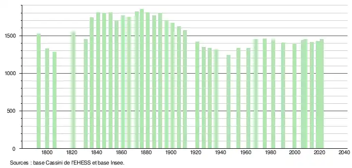 L'évolution du nombre d'habitants est connue à travers les recensements de la population effectués dans la commune depuis 1793. Pour les communes de moins de 10 000 habitants, une enquête de recensement portant sur toute la population est réalisée tous les cinq ans, les populations légales des années intermédiaires étant quant à elles estimées par interpolation ou extrapolation[30]. Pour la commune, le premier recensement exhaustif entrant dans le cadre du nouveau dispositif a été réalisé en 2008[31].