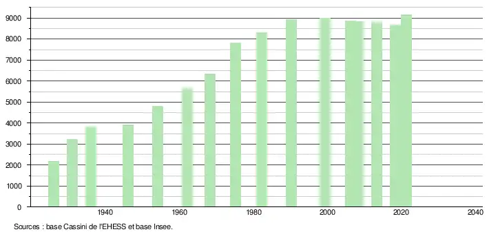 L'évolution du nombre d'habitants est connue à travers les recensements de la population effectués dans la commune depuis 1926. Pour les communes de moins de 10 000 habitants, une enquête de recensement portant sur toute la population est réalisée tous les cinq ans, les populations légales des années intermédiaires étant quant à elles estimées par interpolation ou extrapolation[34]. Pour la commune, le premier recensement exhaustif entrant dans le cadre du nouveau dispositif a été réalisé en 2008[35].