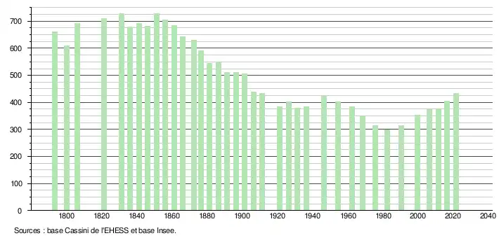 L'évolution du nombre d'habitants est connue à travers les recensements de la population effectués dans la commune depuis 1793. Pour les communes de moins de 10 000 habitants, une enquête de recensement portant sur toute la population est réalisée tous les cinq ans, les populations légales des années intermédiaires étant quant à elles estimées par interpolation ou extrapolation[25]. Pour la commune, le premier recensement exhaustif entrant dans le cadre du nouveau dispositif a été réalisé en 2006[26].