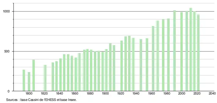 L'évolution du nombre d'habitants est connue à travers les recensements de la population effectués dans la commune depuis 1793. Pour les communes de moins de 10 000 habitants, une enquête de recensement portant sur toute la population est réalisée tous les cinq ans, les populations légales des années intermédiaires étant quant à elles estimées par interpolation ou extrapolation[27]. Pour la commune, le premier recensement exhaustif entrant dans le cadre du nouveau dispositif a été réalisé en 2006[28].