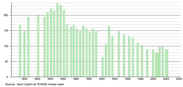 L'évolution du nombre d'habitants est connue à travers les recensements de la population effectués dans la commune depuis 1793. Pour les communes de moins de 10 000 habitants, une enquête de recensement portant sur toute la population est réalisée tous les cinq ans, les populations légales des années intermédiaires étant quant à elles estimées par interpolation ou extrapolation[22]. Pour la commune, le premier recensement exhaustif entrant dans le cadre du nouveau dispositif a été réalisé en 2004[23].