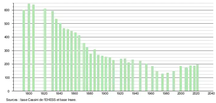 L'évolution du nombre d'habitants est connue à travers les recensements de la population effectués dans la commune depuis 1793. Pour les communes de moins de 10 000 habitants, une enquête de recensement portant sur toute la population est réalisée tous les cinq ans, les populations légales des années intermédiaires étant quant à elles estimées par interpolation ou extrapolation[26]. Pour la commune, le premier recensement exhaustif entrant dans le cadre du nouveau dispositif a été réalisé en 2007[27].
