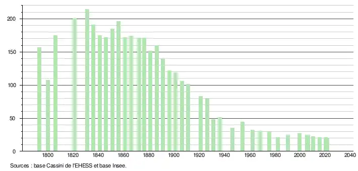 L'évolution du nombre d'habitants est connue à travers les recensements de la population effectués dans la commune depuis 1793. Pour les communes de moins de 10 000 habitants, une enquête de recensement portant sur toute la population est réalisée tous les cinq ans, les populations légales des années intermédiaires étant quant à elles estimées par interpolation ou extrapolation[17]. Pour la commune, le premier recensement exhaustif entrant dans le cadre du nouveau dispositif a été réalisé en 2005[18].