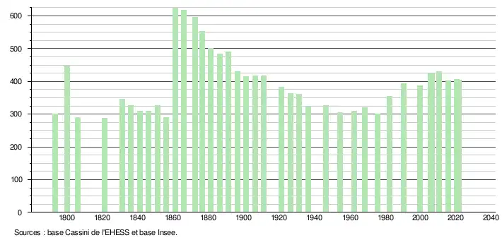 L'évolution du nombre d'habitants est connue à travers les recensements de la population effectués dans la commune depuis 1793. Pour les communes de moins de 10 000 habitants, une enquête de recensement portant sur toute la population est réalisée tous les cinq ans, les populations légales des années intermédiaires étant quant à elles estimées par interpolation ou extrapolation[30]. Pour la commune, le premier recensement exhaustif entrant dans le cadre du nouveau dispositif a été réalisé en 2005[31].