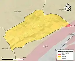 Le retrait-gonflement des sols argileux est susceptible d'engendrer des dommages importants aux bâtiments en cas d’alternance de périodes de sécheresse et de pluie. La totalité de la commune est en aléa moyen ou fort (59,3 % au niveau départemental et 48,5 % au niveau national). Sur les 171 bâtiments dénombrés sur la commune en 2019, 171 sont en aléa moyen ou fort, soit 100 %, à comparer aux 85 % au niveau départemental et 54 % au niveau national. Une cartographie de l'exposition du territoire national au retrait gonflement des sols argileux est disponible sur le site du BRGM[16],[Carte 2].