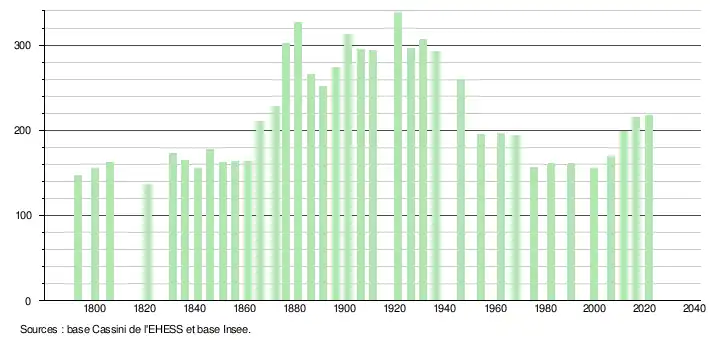 L'évolution du nombre d'habitants est connue à travers les recensements de la population effectués dans la commune depuis 1793. Pour les communes de moins de 10 000 habitants, une enquête de recensement portant sur toute la population est réalisée tous les cinq ans, les populations légales des années intermédiaires étant quant à elles estimées par interpolation ou extrapolation[25]. Pour la commune, le premier recensement exhaustif entrant dans le cadre du nouveau dispositif a été réalisé en 2006[26].