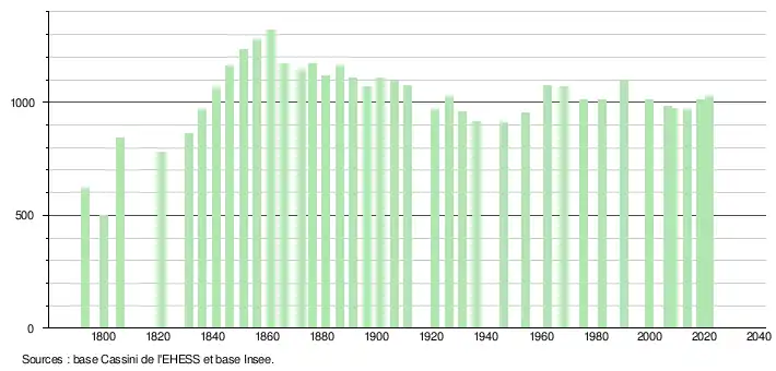 L'évolution du nombre d'habitants est connue à travers les recensements de la population effectués dans la commune depuis 1793. Pour les communes de moins de 10 000 habitants, une enquête de recensement portant sur toute la population est réalisée tous les cinq ans, les populations légales des années intermédiaires étant quant à elles estimées par interpolation ou extrapolation[26]. Pour la commune, le premier recensement exhaustif entrant dans le cadre du nouveau dispositif a été réalisé en 2008[27].