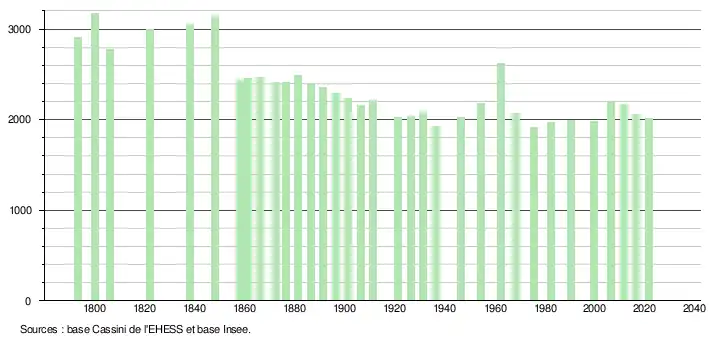 - Population municipale légale en vigueur au 1er janvier 2024, millésimée 2021, définie dans les limites territoriales en vigueur au 1er janvier 2023, date de référence statistique : 1er janvier 2021.