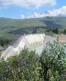 - le plus connu, le barrage de Roselend (1962), situé entre le col du Pré (qui domine la petite ville d'Arêches) et le Cormet de Roselend, a englouti lors de sa mise en eau le petit village d'alpage dont le lac tire son nom ;