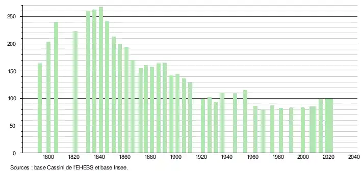 L'évolution du nombre d'habitants est connue à travers les recensements de la population effectués dans la commune depuis 1793. Pour les communes de moins de 10 000 habitants, une enquête de recensement portant sur toute la population est réalisée tous les cinq ans, les populations légales des années intermédiaires étant quant à elles estimées par interpolation ou extrapolation[22]. Pour la commune, le premier recensement exhaustif entrant dans le cadre du nouveau dispositif a été réalisé en 2008[23].