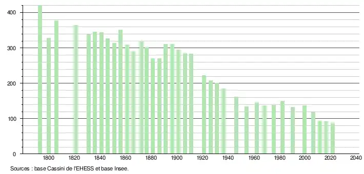 L'évolution du nombre d'habitants est connue à travers les recensements de la population effectués dans la commune depuis 1793. Pour les communes de moins de 10 000 habitants, une enquête de recensement portant sur toute la population est réalisée tous les cinq ans, les populations légales des années intermédiaires étant quant à elles estimées par interpolation ou extrapolation[16]. Pour la commune, le premier recensement exhaustif entrant dans le cadre du nouveau dispositif a été réalisé en 2006[17].