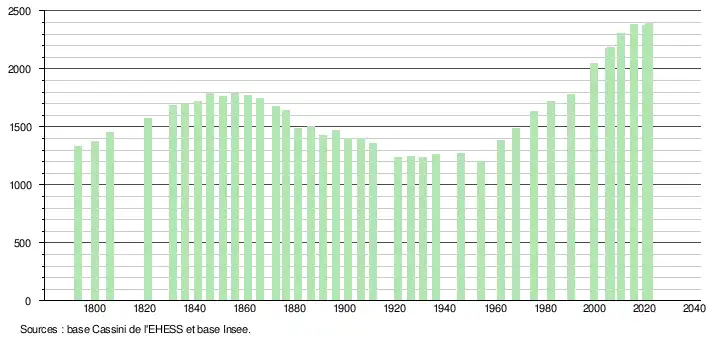 L'évolution du nombre d'habitants est connue à travers les recensements de la population effectués dans la commune depuis 1793. Pour les communes de moins de 10 000 habitants, une enquête de recensement portant sur toute la population est réalisée tous les cinq ans, les populations légales des années intermédiaires étant quant à elles estimées par interpolation ou extrapolation[31]. Pour la commune, le premier recensement exhaustif entrant dans le cadre du nouveau dispositif a été réalisé en 2005[32].