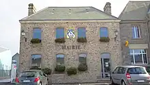 Blasonnement : D'azur au chevron d'argent chargé de trois merlettes du champ, celles en pointe affrontées, et accompagné de trois trèfles d'or. Ces armes seraient celles de Thomasse de Beaumont, épouse de Raoul d'Argouges en 1332. Ce sont également celles des Jallot, seigneurs de la paroisse jusqu'à la Révolution[41]. |