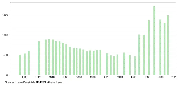 L'évolution du nombre d'habitants est connue à travers les recensements de la population effectués dans la commune depuis 1793. À partir du , les populations légales des communes sont publiées annuellement dans le cadre d'un recensement qui repose désormais sur une collecte d'information annuelle, concernant successivement tous les territoires communaux au cours d'une période de cinq ans. Pour les communes de moins de 10 000 habitants, une enquête de recensement portant sur toute la population est réalisée tous les cinq ans, les populations légales des années intermédiaires étant quant à elles estimées par interpolation ou extrapolation[16]. Pour la commune, le premier recensement exhaustif entrant dans le cadre du nouveau dispositif a été réalisé en 2005[17],[Note 3].
