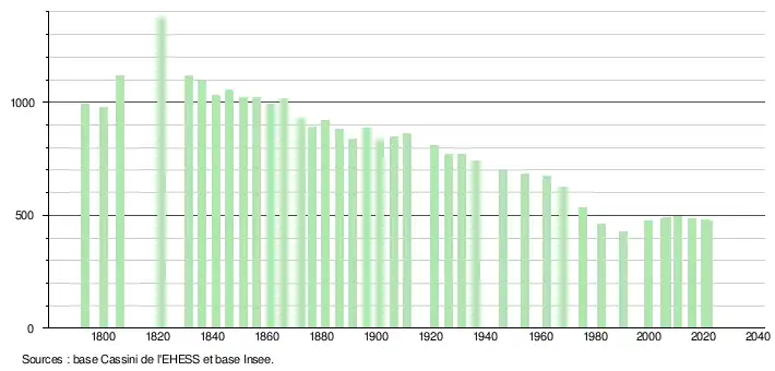 L'évolution du nombre d'habitants est connue à travers les recensements de la population effectués dans la commune depuis 1793. Pour les communes de moins de 10 000 habitants, une enquête de recensement portant sur toute la population est réalisée tous les cinq ans, les populations légales des années intermédiaires étant quant à elles estimées par interpolation ou extrapolation[17]. Pour la commune, le premier recensement exhaustif entrant dans le cadre du nouveau dispositif a été réalisé en 2005[18].