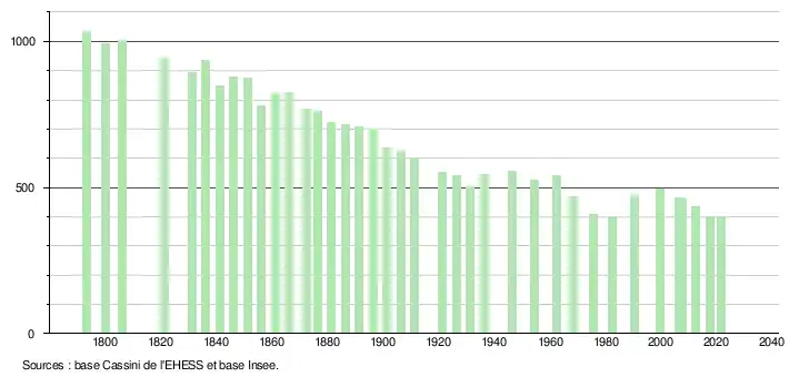 L'évolution du nombre d'habitants est connue à travers les recensements de la population effectués dans la commune depuis 1793. Pour les communes de moins de 10 000 habitants, une enquête de recensement portant sur toute la population est réalisée tous les cinq ans, les populations légales des années intermédiaires étant quant à elles estimées par interpolation ou extrapolation[20]. Pour la commune, le premier recensement exhaustif entrant dans le cadre du nouveau dispositif a été réalisé en 2007[21].