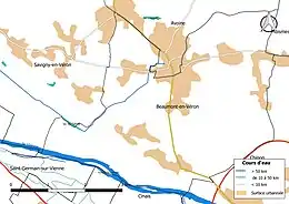 L'occupation des sols de la commune, telle qu'elle ressort de la base de données européenne d’occupation biophysique des sols Corine Land Cover (CLC), est marquée par l'importance des territoires agricoles (67,3 % en 2018), néanmoins en diminution par rapport à 1990 (68,7 %). La répartition détaillée en 2018 est la suivante : zones agricoles hétérogènes (20,4 %), terres arables (18,7 %), cultures permanentes (17 %), zones urbanisées (15 %), forêts (13,8 %), prairies (11,2 %), eaux continentales[Note 3] (3 %), zones industrielles ou commerciales et réseaux de communication (0,8 %)[19]. L'évolution de l’occupation des sols de la commune et de ses infrastructures peut être observée sur les différentes représentations cartographiques du territoire : la carte de Cassini (XVIIIe siècle), la carte d'état-major (1820-1866) et les cartes ou photos aériennes de l'IGN pour la période actuelle (1950 à aujourd'hui)[Carte 1].