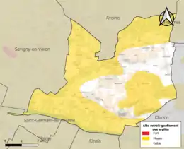 La commune est vulnérable au risque de mouvements de terrains constitué principalement du retrait-gonflement des sols argileux[24]. Cet aléa est susceptible d'engendrer des dommages importants aux bâtiments en cas d’alternance de périodes de sécheresse et de pluie. 72 % de la superficie communale est en aléa moyen ou fort (90,2 % au niveau départemental et 48,5 % au niveau national). Sur les 1 390 bâtiments dénombrés sur la commune en 2019, 928 sont en aléa moyen ou fort, soit 67 %, à comparer aux 91 % au niveau départemental et 54 % au niveau national. Une cartographie de l'exposition du territoire national au retrait gonflement des sols argileux est disponible sur le site du BRGM[25],[26].
