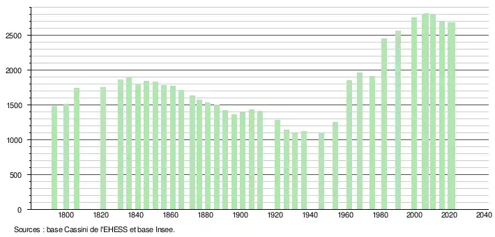 L'évolution du nombre d'habitants est connue à travers les recensements de la population effectués dans la commune depuis 1793. Pour les communes de moins de 10 000 habitants, une enquête de recensement portant sur toute la population est réalisée tous les cinq ans, les populations légales des années intermédiaires étant quant à elles estimées par interpolation ou extrapolation[30]. Pour la commune, le premier recensement exhaustif entrant dans le cadre du nouveau dispositif a été réalisé en 2005[31].