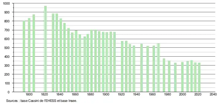 L'évolution du nombre d'habitants est connue à travers les recensements de la population effectués dans la commune depuis 1793. Pour les communes de moins de 10 000 habitants, une enquête de recensement portant sur toute la population est réalisée tous les cinq ans, les populations légales des années intermédiaires étant quant à elles estimées par interpolation ou extrapolation[21]. Pour la commune, le premier recensement exhaustif entrant dans le cadre du nouveau dispositif a été réalisé en 2006[22].