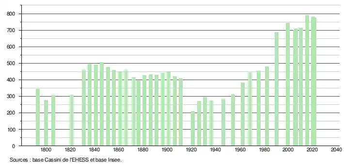 L'évolution du nombre d'habitants est connue à travers les recensements de la population effectués dans la commune depuis 1793. Pour les communes de moins de 10 000 habitants, une enquête de recensement portant sur toute la population est réalisée tous les cinq ans, les populations légales des années intermédiaires étant quant à elles estimées par interpolation ou extrapolation[20]. Pour la commune, le premier recensement exhaustif entrant dans le cadre du nouveau dispositif a été réalisé en 2005[21].