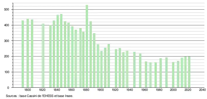 L'évolution du nombre d'habitants est connue à travers les recensements de la population effectués dans la commune depuis 1793. Pour les communes de moins de 10 000 habitants, une enquête de recensement portant sur toute la population est réalisée tous les cinq ans, les populations légales des années intermédiaires étant quant à elles estimées par interpolation ou extrapolation[13]. Pour la commune, le premier recensement exhaustif entrant dans le cadre du nouveau dispositif a été réalisé en 2006[14].