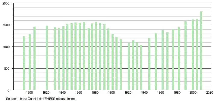 L'évolution du nombre d'habitants est connue à travers les recensements de la population effectués dans la commune depuis 1793. À partir du , les populations légales des communes sont publiées annuellement dans le cadre d'un recensement qui repose désormais sur une collecte d'information annuelle, concernant successivement tous les territoires communaux au cours d'une période de cinq ans. Pour les communes de moins de 10 000 habitants, une enquête de recensement portant sur toute la population est réalisée tous les cinq ans, les populations légales des années intermédiaires étant quant à elles estimées par interpolation ou extrapolation[7]. Pour la commune, le premier recensement exhaustif entrant dans le cadre du nouveau dispositif a été réalisé en 2004[8],[Note 1].