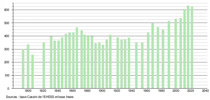 L'évolution du nombre d'habitants est connue à travers les recensements de la population effectués dans la commune depuis 1793. Pour les communes de moins de 10 000 habitants, une enquête de recensement portant sur toute la population est réalisée tous les cinq ans, les populations légales des années intermédiaires étant quant à elles estimées par interpolation ou extrapolation[20]. Pour la commune, le premier recensement exhaustif entrant dans le cadre du nouveau dispositif a été réalisé en 2006[21].