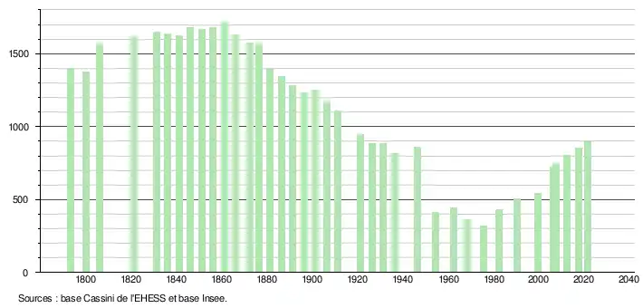 En 2018, la commune comptait 440 hommes pour 423 femmes, soit un taux de 50,98 % d'hommes, largement supérieur au taux départemental (48,45 %).