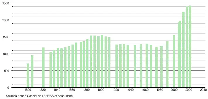 L'évolution du nombre d'habitants est connue à travers les recensements de la population effectués dans la commune depuis 1800. Pour les communes de moins de 10 000 habitants, une enquête de recensement portant sur toute la population est réalisée tous les cinq ans, les populations légales des années intermédiaires étant quant à elles estimées par interpolation ou extrapolation[20]. Pour la commune, le premier recensement exhaustif entrant dans le cadre du nouveau dispositif a été réalisé en 2007[21].