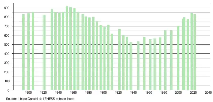 L'évolution du nombre d'habitants est connue à travers les recensements de la population effectués dans la commune depuis 1793. Pour les communes de moins de 10 000 habitants, une enquête de recensement portant sur toute la population est réalisée tous les cinq ans, les populations légales des années intermédiaires étant quant à elles estimées par interpolation ou extrapolation[28]. Pour la commune, le premier recensement exhaustif entrant dans le cadre du nouveau dispositif a été réalisé en 2007[29].