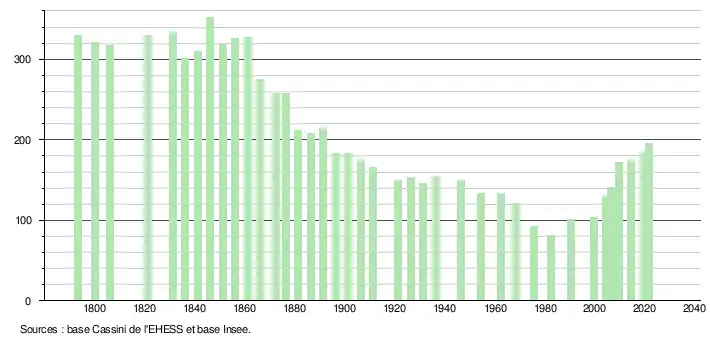 L'évolution du nombre d'habitants est connue à travers les recensements de la population effectués dans la commune depuis 1793. Pour les communes de moins de 10 000 habitants, une enquête de recensement portant sur toute la population est réalisée tous les cinq ans, les populations légales des années intermédiaires étant quant à elles estimées par interpolation ou extrapolation[31]. Pour la commune, le premier recensement exhaustif entrant dans le cadre du nouveau dispositif a été réalisé en 2004[32].