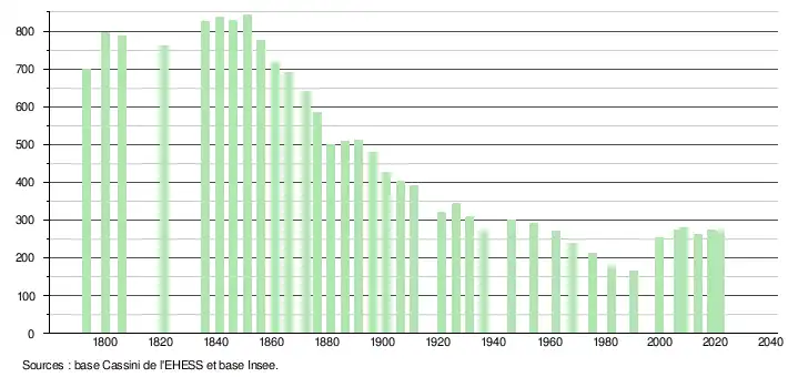 L'évolution du nombre d'habitants est connue à travers les recensements de la population effectués dans la commune depuis 1793. Pour les communes de moins de 10 000 habitants, une enquête de recensement portant sur toute la population est réalisée tous les cinq ans, les populations légales des années intermédiaires étant quant à elles estimées par interpolation ou extrapolation[19]. Pour la commune, le premier recensement exhaustif entrant dans le cadre du nouveau dispositif a été réalisé en 2008[20].