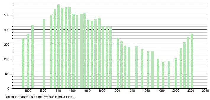 L'évolution du nombre d'habitants est connue à travers les recensements de la population effectués dans la commune depuis 1793. Pour les communes de moins de 10 000 habitants, une enquête de recensement portant sur toute la population est réalisée tous les cinq ans, les populations légales des années intermédiaires étant quant à elles estimées par interpolation ou extrapolation[31]. Pour la commune, le premier recensement exhaustif entrant dans le cadre du nouveau dispositif a été réalisé en 2006[32].