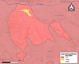 La commune est vulnérable au risque de mouvements de terrains constitué principalement du retrait-gonflement des sols argileux[24]. Cet aléa est susceptible d'engendrer des dommages importants aux bâtiments en cas d’alternance de périodes de sécheresse et de pluie. La totalité de la commune est en aléa moyen ou fort (76,3 % au niveau départemental et 48,5 % au niveau national). Sur les 161 bâtiments dénombrés sur la commune en 2019, 161 sont en aléa moyen ou fort, soit 100 %, à comparer aux 90 % au niveau départemental et 54 % au niveau national. Une cartographie de l'exposition du territoire national au retrait gonflement des sols argileux est disponible sur le site du BRGM[25],[Carte 3].