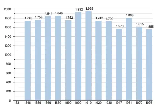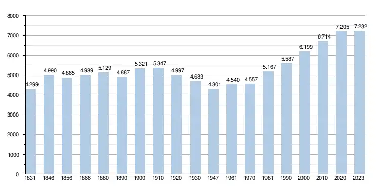 Les chiffres des années 1831 à 1970 tiennent compte des chiffres des anciennes communes fusionnées.