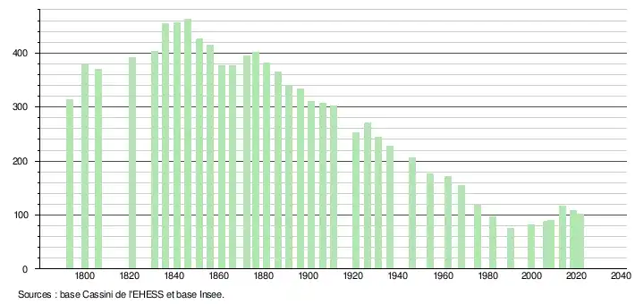 L'évolution du nombre d'habitants est connue à travers les recensements de la population effectués dans la commune depuis 1793. Pour les communes de moins de 10 000 habitants, une enquête de recensement portant sur toute la population est réalisée tous les cinq ans, les populations légales des années intermédiaires étant quant à elles estimées par interpolation ou extrapolation[28]. Pour la commune, le premier recensement exhaustif entrant dans le cadre du nouveau dispositif a été réalisé en 2008[29].