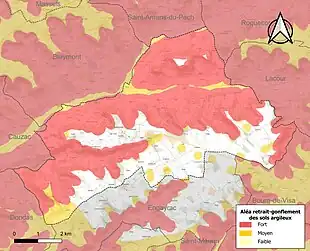 Le retrait-gonflement des sols argileux est susceptible d'engendrer des dommages importants aux bâtiments en cas d’alternance de périodes de sécheresse et de pluie[20]. 71,1 % de la superficie communale est en aléa moyen ou fort (91,8 % au niveau départemental et 48,5 % au niveau national)[Carte 2]. Depuis le , en application de la loi ELAN, différentes contraintes s'imposent aux vendeurs, maîtres d'ouvrages ou constructeurs de biens situés dans une zone classée en aléa moyen ou fort[Note 3],[21].