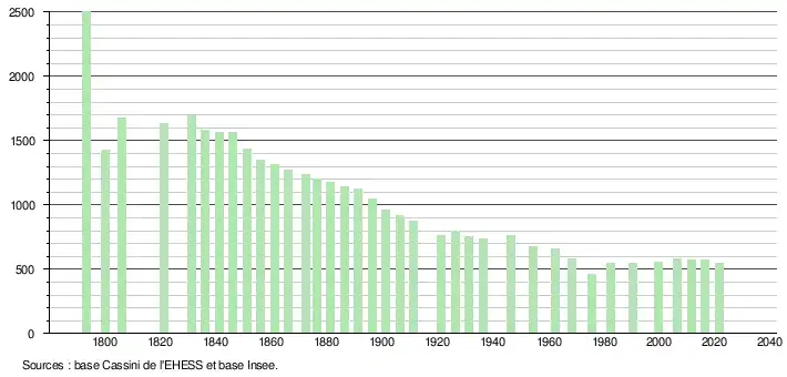 L'évolution du nombre d'habitants est connue à travers les recensements de la population effectués dans la commune depuis 1793. Pour les communes de moins de 10 000 habitants, une enquête de recensement portant sur toute la population est réalisée tous les cinq ans, les populations légales des années intermédiaires étant quant à elles estimées par interpolation ou extrapolation[27]. Pour la commune, le premier recensement exhaustif entrant dans le cadre du nouveau dispositif a été réalisé en 2006[28].