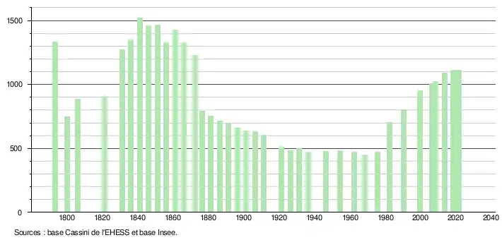 L'évolution du nombre d'habitants est connue à travers les recensements de la population effectués dans la commune depuis 1793. Pour les communes de moins de 10 000 habitants, une enquête de recensement portant sur toute la population est réalisée tous les cinq ans, les populations légales des années intermédiaires étant quant à elles estimées par interpolation ou extrapolation[19]. Pour la commune, le premier recensement exhaustif entrant dans le cadre du nouveau dispositif a été réalisé en 2008[20].