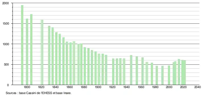 L'évolution du nombre d'habitants est connue à travers les recensements de la population effectués dans la commune depuis 1793. Pour les communes de moins de 10 000 habitants, une enquête de recensement portant sur toute la population est réalisée tous les cinq ans, les populations légales des années intermédiaires étant quant à elles estimées par interpolation ou extrapolation[18]. Pour la commune, le premier recensement exhaustif entrant dans le cadre du nouveau dispositif a été réalisé en 2008[19].