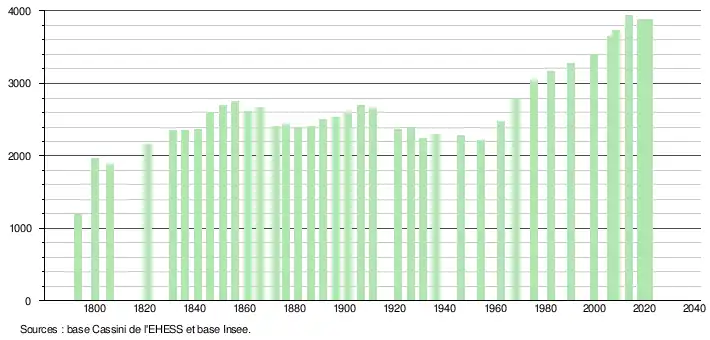 L'évolution du nombre d'habitants est connue à travers les recensements de la population effectués dans la commune depuis 1793. Pour les communes de moins de 10 000 habitants, une enquête de recensement portant sur toute la population est réalisée tous les cinq ans, les populations légales des années intermédiaires étant quant à elles estimées par interpolation ou extrapolation[39]. Pour la commune, le premier recensement exhaustif entrant dans le cadre du nouveau dispositif a été réalisé en 2008[40].