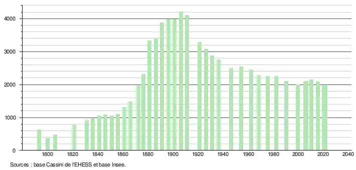 L'évolution du nombre d'habitants est connue à travers les recensements de la population effectués dans la commune depuis 1793. Pour les communes de moins de 10 000 habitants, une enquête de recensement portant sur toute la population est réalisée tous les cinq ans, les populations légales des années intermédiaires étant quant à elles estimées par interpolation ou extrapolation[35]. Pour la commune, le premier recensement exhaustif entrant dans le cadre du nouveau dispositif a été réalisé en 2005[36].