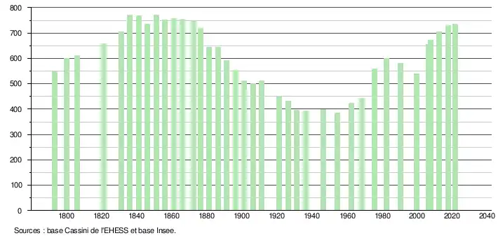 L'évolution du nombre d'habitants est connue à travers les recensements de la population effectués dans la commune depuis 1793. Pour les communes de moins de 10 000 habitants, une enquête de recensement portant sur toute la population est réalisée tous les cinq ans, les populations légales des années intermédiaires étant quant à elles estimées par interpolation ou extrapolation[20]. Pour la commune, le premier recensement exhaustif entrant dans le cadre du nouveau dispositif a été réalisé en 2007[21].