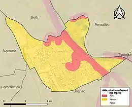 La commune est vulnérable au risque de mouvements de terrains constitué principalement du retrait-gonflement des sols argileux[34]. Cet aléa est susceptible d'engendrer des dommages importants aux bâtiments en cas d’alternance de périodes de sécheresse et de pluie. La totalité de la commune est en aléa moyen ou fort (88,8 % au niveau départemental et 48,5 % au niveau national). Sur les 1 739 bâtiments dénombrés sur la commune en 2019, 1 739 sont en aléa moyen ou fort, soit 100 %, à comparer aux 98 % au niveau départemental et 54 % au niveau national. Une cartographie de l'exposition du territoire national au retrait gonflement des sols argileux est disponible sur le site du BRGM[35],[Carte 2].