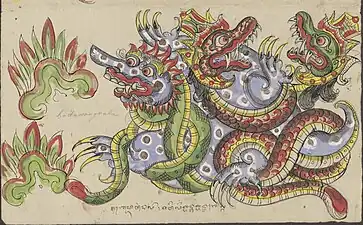 Il porte le monde sur son dos (en s'agitant, il provoque les séismes), figuré par deux nāga (serpents mythiques), Naga Basuki et Naga Antaboga, qui représentent les besoins humains (nourriture, habillement, logement et sécurité) et agissent comme agents stabilisateurs[2], ainsi que la Pierre noire qui couvre l'entrée du monde souterrain[1].