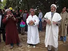 La rythmique du texte est imprimée par le chanteur, marquant le mizane (le tempo) avec le gallal, à ses côtés, les flûtistes en général deux suivent. Le premier est appelé erquiza (base, principal) et le deuxième, r'dif (second)[2].